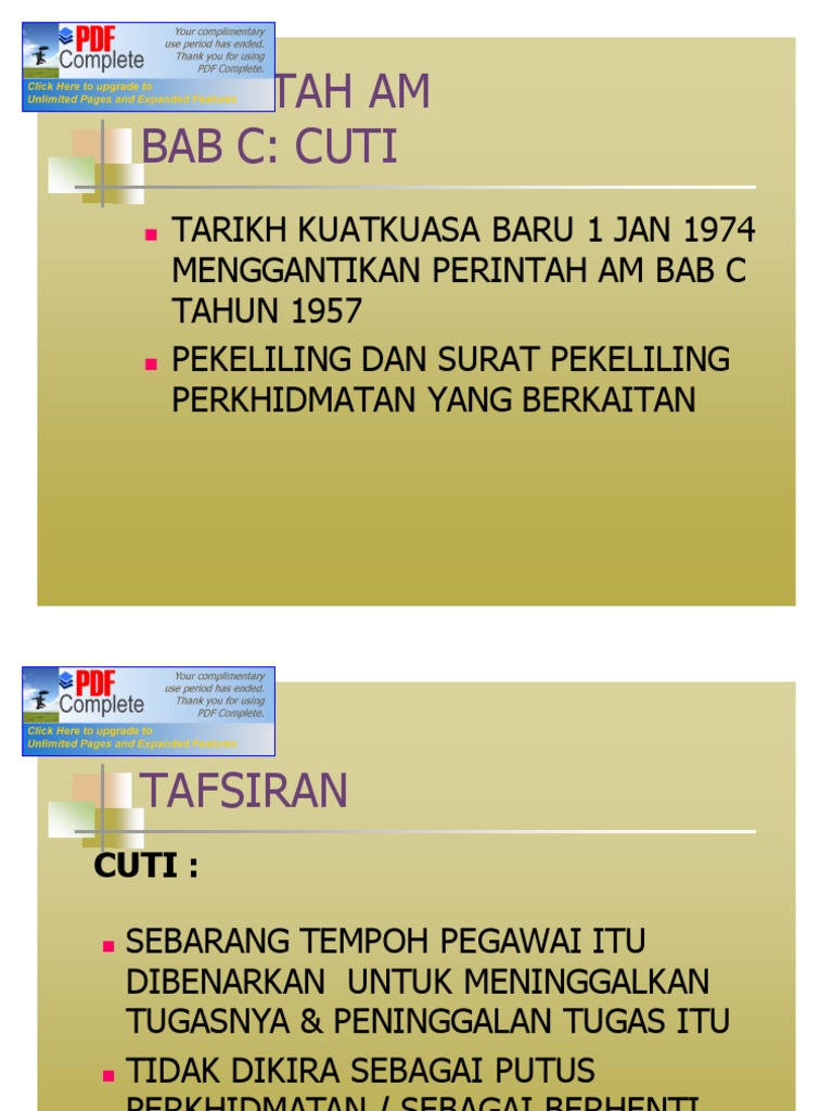 This file you can free download and published on : Cuti tarikh kuatkuasa baru 1 jan 1974 menggantikan perintah am bab c tahun 1957 p994728. Tempoh pegawai dibenar meninggalkan tugas tanpa dikira sebagai putus perkhidmatan atau berhenti kerja. September 2nd, 2012 file name : Sebarang tempoh seseorang pegawai dibenarkan meninggalkan tugasnya tanpa dianggap sebagai putus perkhidmatan atau sebagai berhenti kerja.