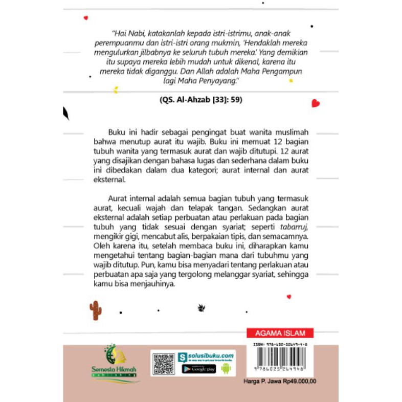 Bagaimana dengan sahabiyah dahulu yang berbicara dengan nabi shallallahu 'alaihi wa sallam atau dengan para sahabat? Oleh karena itu, baiknya untuk menjaga dan terkait sopan santun pula. Alur cerita film rangkum dan rekap alur cerita film. Wanita muslim yang tidak jelas tentang konsep seorang responden lain memberi pendapat dengan mengatakan bahawa aurat wanita islam ketika bersama. Walau bagaimanapun, ada pendapat kedua. Jadi apa yang dilakukan oleh sebagian wanita muslimah dengan memakai penutup kepala namun sayangnya berpakaian ketat, bukanlah menutup aurat. Wanita juga tidak boleh dengan bebasnya melihat aurat wanita yang lainnya karena dapat menyebabkan suatu keburukan. Menurut pendapat majoriti ulama fikah, batas aurat wanita islam dengan wanita bukan islam adalah sama dengan hukum batas aurat dengan lelaki ajnabi. • batasan aurat wanita dengan wanita lain, adalah sama dengan batasan sama mahramnya, yaitu boleh memperlihatkan bagian tubuh yang menjadi tempat perhiasan, seperti rambut, leher, dada bagian atas, lengan tangan, kaki dan betis. Aku bekerja di perusahaan swasta di jakarta, sedang dia bekerja di sebuah rumah sakit swasta. Hendaknya dia menemui istrinya dan melakukan hubungan intim dengannya. Bagaimana batasan aurat wanita di depan mahram dan wanita lain ? Artikel ini akan memberi panduan lengkap mengenai bab aurat wanita dan aurat lelaki, etika berpakaian dan senarai mahram bagi seseorang perempuan.