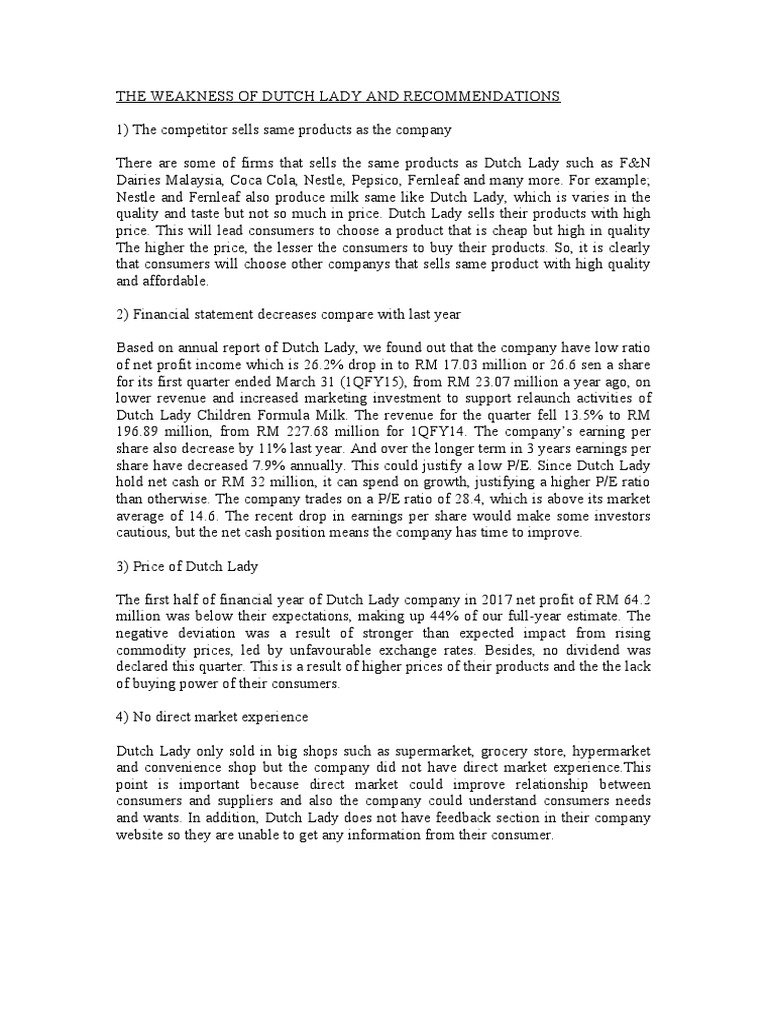 Dutch Lady Swot Analysis Essays - Comparative Analysis John Lewis Example For Free Free Essay Example Studydriver Com / Apr 28, 2013 · plan summary 3 3.1 market situation 3 3.2 swot analysis 4 3.3 marketing stratagy 4 3.4 control 4 ii.. What makes dutch lady strength a good company? Price factors of dutch lady. Swot analysis of dutch lady. What does dutch lady milk industries berhad do? But in food and beverage industry the threat of new entrant is high because food and beverage industry are quite easy to enter as the capital condition of entry is low.